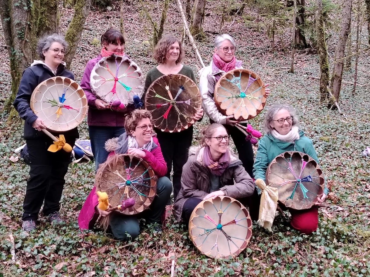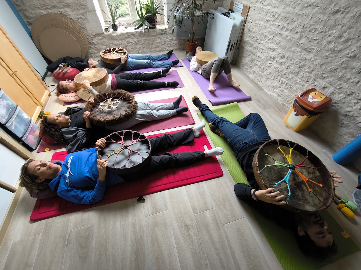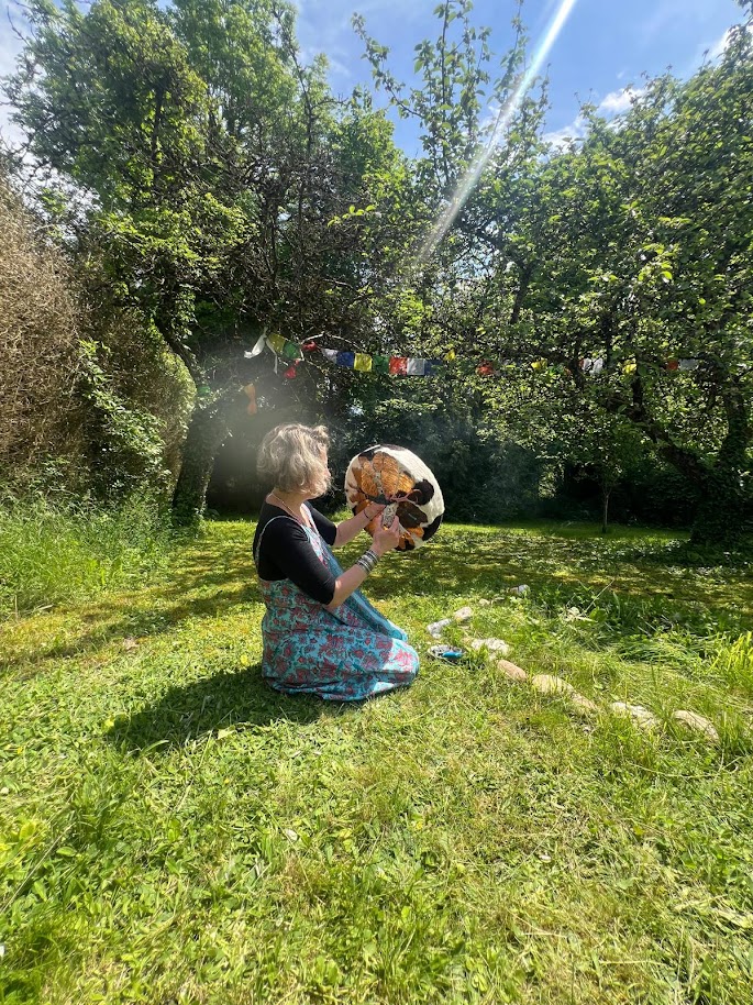 Un tambour que j’ai créé de mes mains, qui m’a fait vibrer, pleurer, mise en joie, me sentir vivante. Puis un deuxième, un troisième, ont été mis au monde, une famille de tambour qui m’accompagnent aujourd’hui dans les soins, pour les autres, pour moi-même. Chaque fois je me reconnectais d’avantage à moi-même, à mon enfant intérieur, à la joie innée qui le porte.
