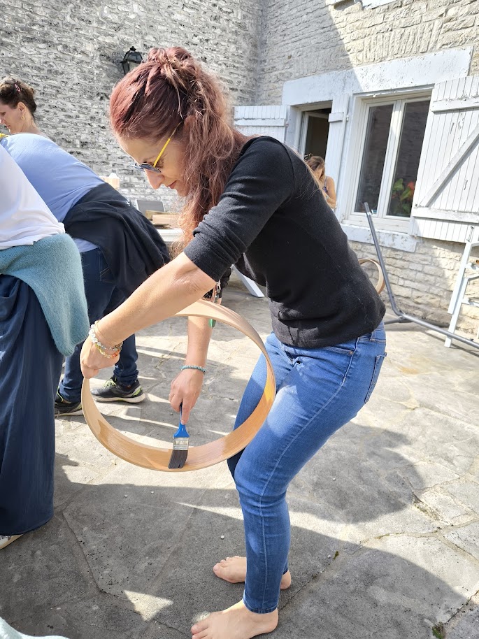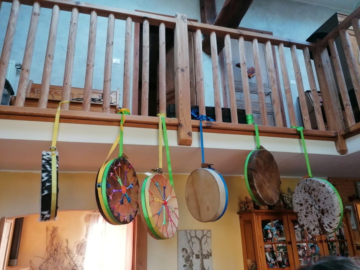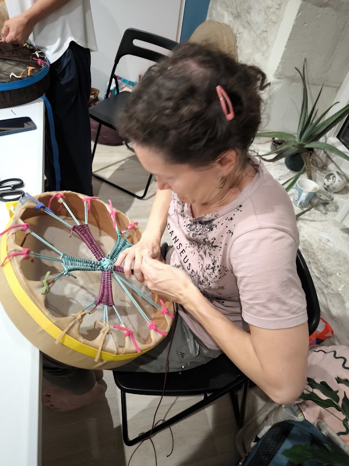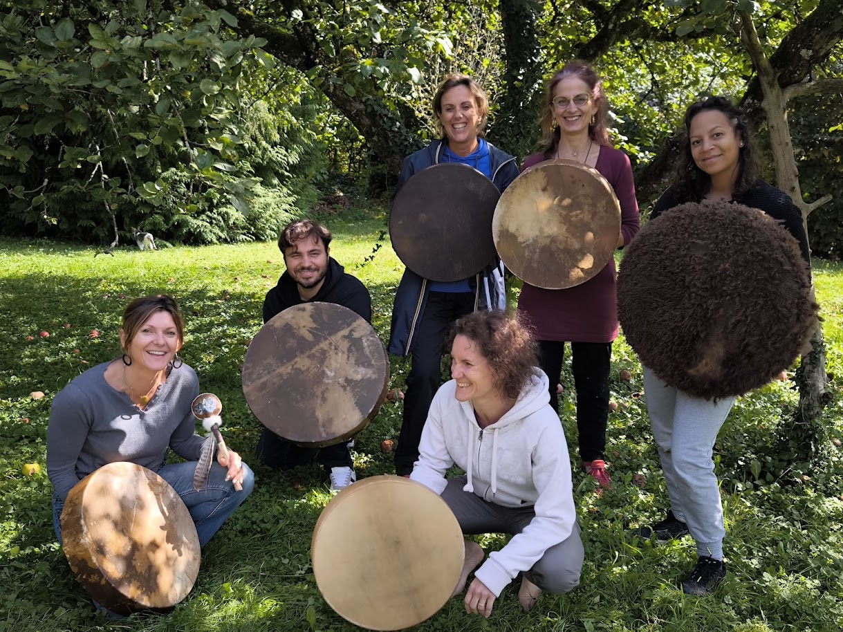 Un tambour que j’ai créé de mes mains, qui m’a fait vibrer, pleurer, mise en joie, me sentir vivante. Puis un deuxième, un troisième, ont été mis au monde, une famille de tambour qui m’accompagnent aujourd’hui dans les soins, pour les autres, pour moi-même. Chaque fois je me reconnectais d’avantage à moi-même, à mon enfant intérieur, à la joie innée qui le porte.